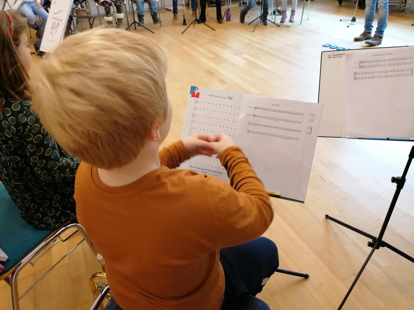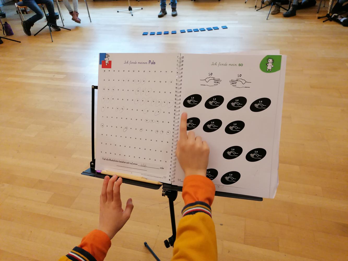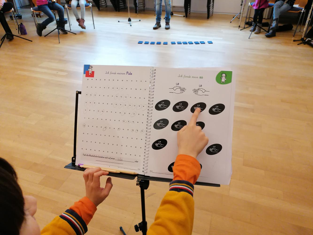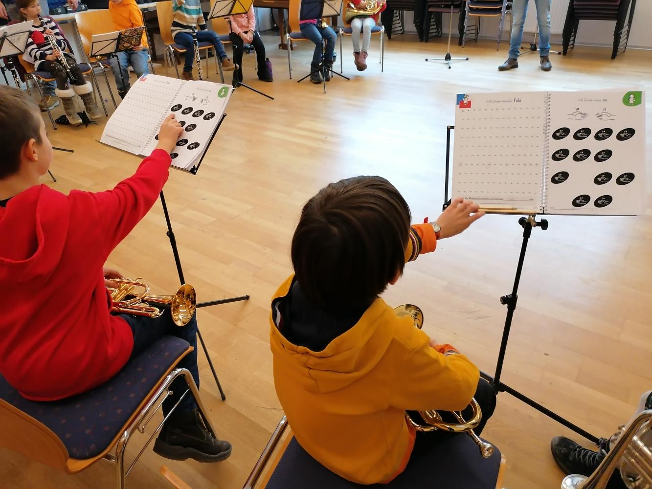Die Kinder der Bläserklasse erlernen auch Musiktheorie. Im tollen Musizier-Werkstatt-Buch wird immer wieder etwas Neues für das gemeinsame Musizieren erarbeitet. So kennen die Kinder bereits musikalischen Begriffe wie: Puls, Takt, so, mi, pst, mi, ta, titi.